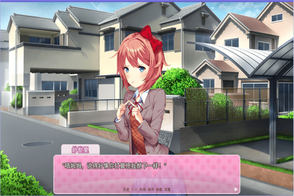 轉(zhuǎn)過天來,去學(xué)校遇到monika,在monika的建議下去sayori家接她——在進sayori家之前存檔。開始新游戲。