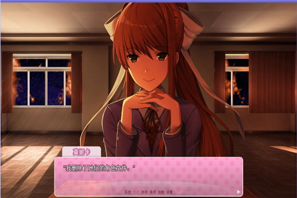 面對得到部長權(quán)限將要黑化的sayori,monika決心刪掉游戲來拯救這一切。伴隨著monika的歌聲,游戲CG一張張被刪除,最后留給玩家的是monika的一封信。