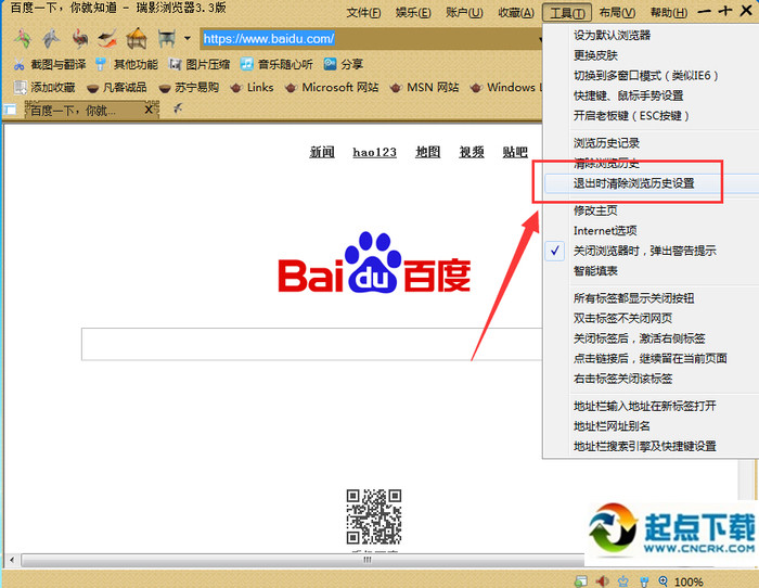5、另外我們還可以在工具中打開【退出時(shí)清除瀏覽歷史設(shè)置】,之后在彈出的窗口中勾選下圖中的選項(xiàng),這樣我們每次退出瀏覽器的時(shí)候它就會(huì)幫我們自動(dòng)清理歷史記錄了。