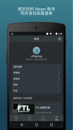 支持綁定 Steam 賬號,綁定賬號之后可以同步你的 Steam 游戲庫及愿望單,之后在你游戲庫和愿望單中的游戲也會被標示出來。你甚至還可以查看你愿望單中所有達到歷史新低的游戲,不再錯過你想玩的任何一款游戲。