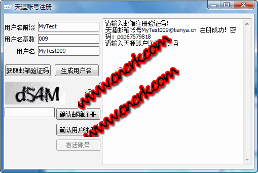天涯論壇賬號(hào)自動(dòng)快速申請器自動(dòng)批量注冊天涯論壇賬號(hào),方便廣大灌水愛好者。另有批量登錄,信息群發(fā),自動(dòng)識(shí)別驗(yàn)證碼功能。