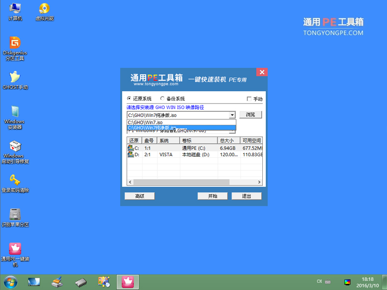 ④運(yùn)行"通用PE一鍵裝機(jī)"工具后,該軟件會(huì)自動(dòng)識(shí)別ISO鏡像文件(即剛才我們下載復(fù)制到U盤GHO文件夾里面的那個(gè)ISO鏡像