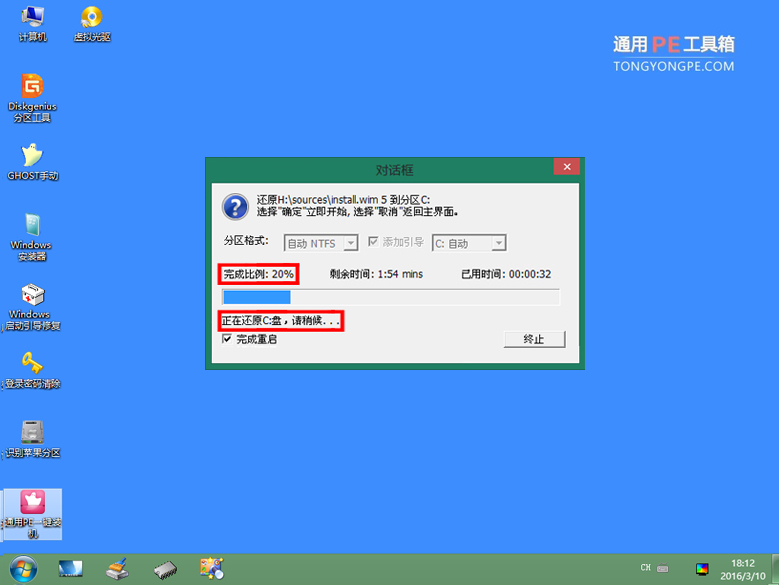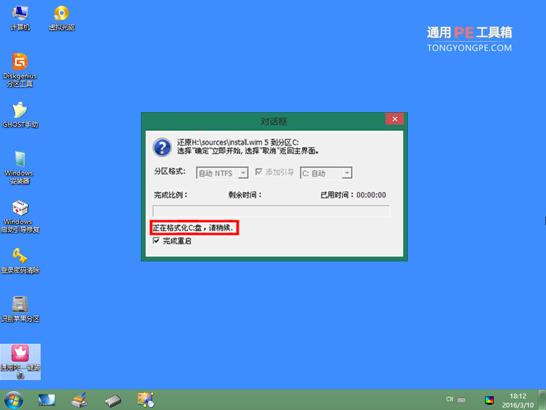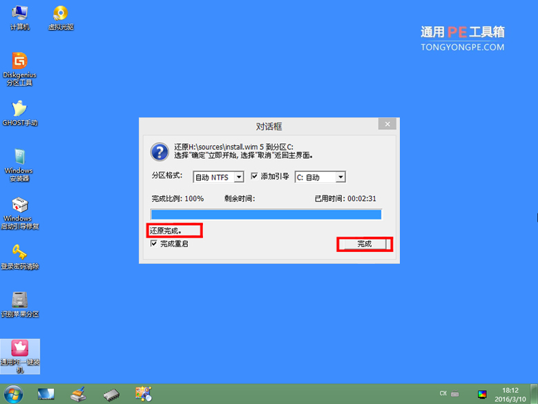 到此,還原完畢了,此時(shí)的這個(gè)完成窗口只會(huì)逗留片刻,無需我們點(diǎn)擊完成按鈕,它會(huì)自動(dòng)重啟電腦了。到此我們屬于通用pe做的事就完成了,接下 來就是系統(tǒng)自己的事了。