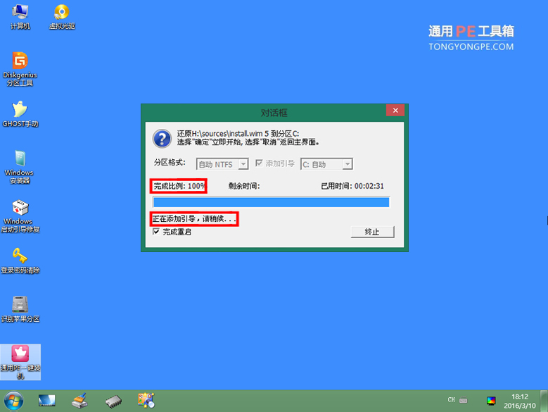 大概需要等待8分鐘左右就完成,完成后軟件自動(dòng)添加引導(dǎo),我們繼續(xù)等待,切勿點(diǎn)終止按鈕!如下圖所示: