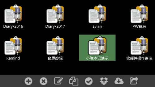 筆記本管理頁面中,每個筆記本以圖標(biāo)的形式排列在頁面上方。雙擊某個筆記圖標(biāo)可直接打開之(將其加載到主界面)。按ESC鍵則返回上一頁(移動設(shè)備則是按home鍵或返回鍵)。其他頁面同此。
