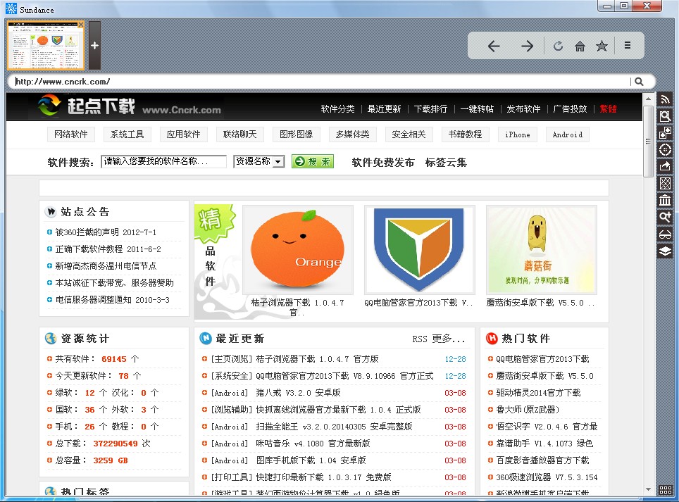 sundance是一款輕量級(jí)的網(wǎng)絡(luò)瀏覽器,功能不是很多,但是軟件的界面很是簡(jiǎn)單清爽,運(yùn)行速度快而且穩(wěn)定,更厲害的是夠小巧,1M都不到!值得嘗試!