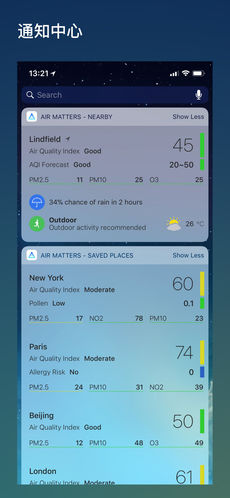 1、支持查詢超過(guò) 50 個(gè)國(guó)家、10000 多個(gè)監(jiān)測(cè)點(diǎn)的空氣質(zhì)量信息,能夠根據(jù)所在位置顯示附近的監(jiān)測(cè)點(diǎn)的監(jiān)測(cè)數(shù)據(jù)。
