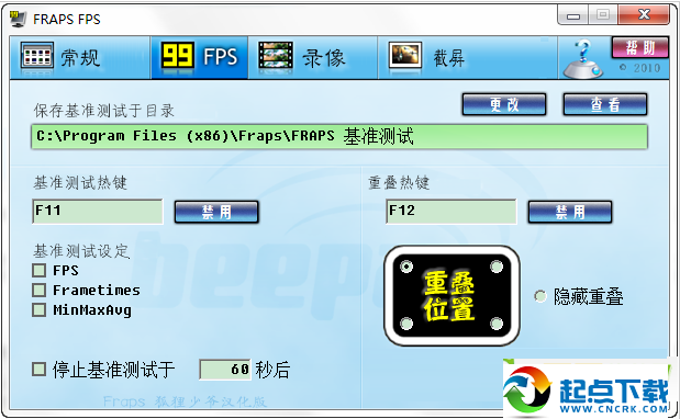 3、”錄象”(如圖):由于我使用的是中文版的FRAPS,大家可以很簡單的就能知道各個設(shè)置的意思,如設(shè)置保存錄象的路徑,設(shè)置熱鍵錄象(我設(shè)置在了 “F12”的功能鍵上),設(shè)置畫面的大小和錄象時使用的幀數(shù)。