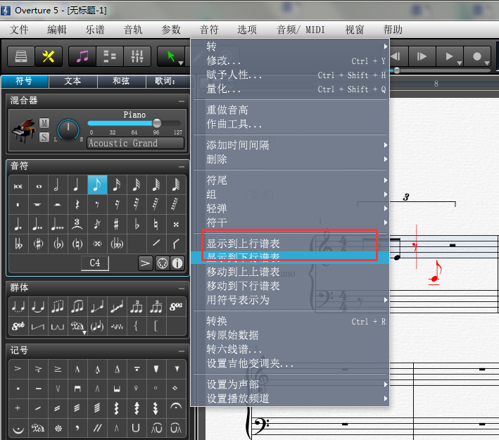 其次,再選中在高音譜表上需要左手彈奏的個別音符并顯示到下行譜表,或選中在低音譜表上的需要右手彈奏的個別音符音符顯示到上行譜表也一樣。這里我們演示的是將需要左手彈奏的顯示到了下行譜表。