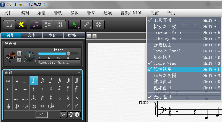 Overture的曲目列表和MIDI數(shù)據(jù)視圖為你提供了強(qiáng)大的編輯功能。它可以把你的MIDI數(shù)據(jù)視為原始數(shù)據(jù)或翻譯成傳統(tǒng)的鋼琴曲譜,或者如果你想編輯MIDI數(shù)據(jù),只需點(diǎn)擊切換到線性視圖。