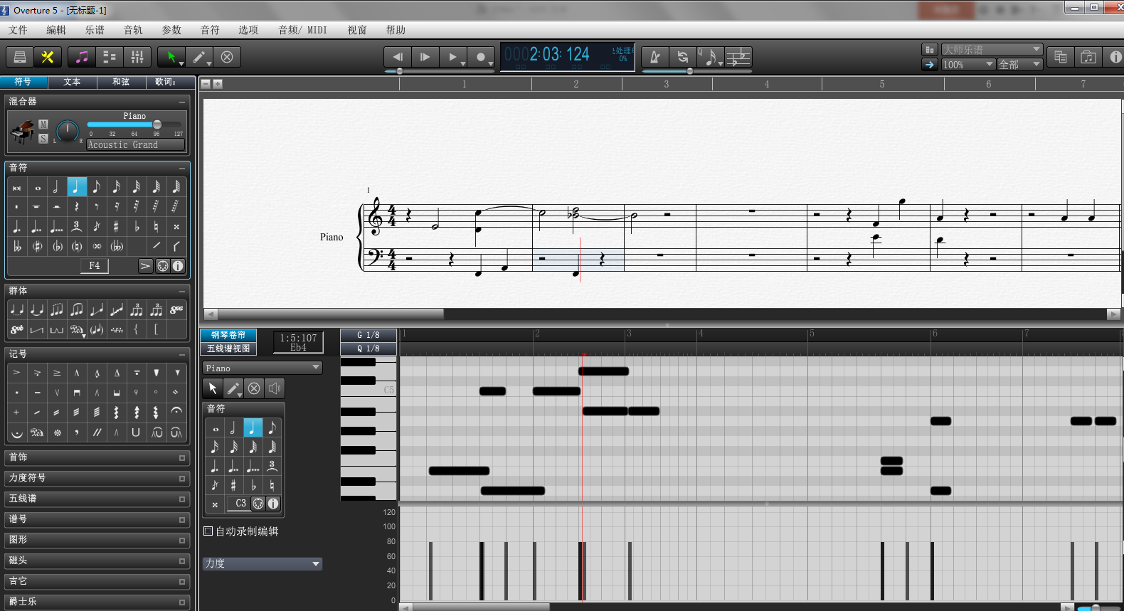 打開Overture軟件,輸入音符,這里需要注意的是,要把需要左右手替換連奏的音符連續(xù)打在同一音軌上,然后選中這些音符,比如八分音符,最后并打上連音符號。
