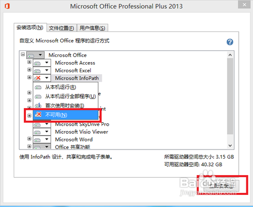 4、在安裝選項(xiàng)中,選擇自己需要的功能安裝,不需要的功能,在單擊該功能會(huì)彈出下拉菜單可以選中不可用,文件位置,默認(rèn),C盤