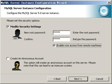 這一步詢問是否要修改默認(rèn)root用戶(超級管理)的密碼(默認(rèn)為空),【New root password】如果要修改,就在此填入新密碼(如果是重裝,并且之前已經(jīng)設(shè)置了密碼,在這里更改密碼可能會出錯,請留空,并將【Modify Security Settings】前面的勾去掉,安裝配置完成后另行修改密碼),【Confirm(再輸一遍)】內(nèi)再填一次,防止輸錯?!綞nable root access from remote machines(是否允許root用戶在其它的機器上登陸,如果要安全,就不要勾上,如果要方便,就勾上它)】。最后【Create An Anonymous Account(新建一個匿名用戶,匿名用戶可以連接數(shù)據(jù)庫,不能操作數(shù)據(jù),包括查詢)】,一般就不用勾了,設(shè)置完畢,按【Next】繼續(xù)。