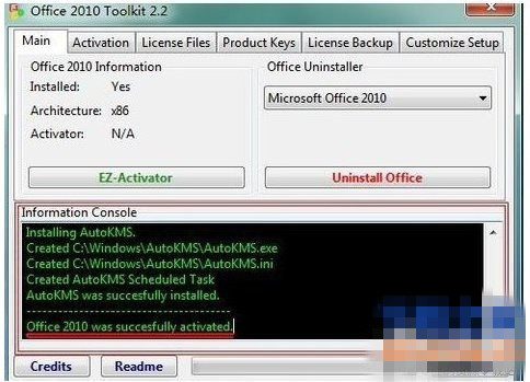 Office 2010 Toolkit(office 2010激活工具)是一個MS Office 2010激活工具。原理就是利用KMS來激活,不是新的激活技術:( 180天后必須手工再次激活一次)。網(wǎng)上流傳的MAK密鑰激活甚稱完美,但有次數(shù)限制,激活后要備份激活信息,以便重裝系統(tǒng)恢復激活。Office 2010 Toolkit也有備份激活信息功能,建議下載一個Office 2010 Toolkit備用。