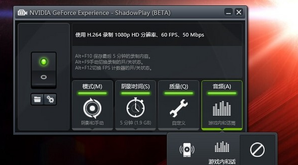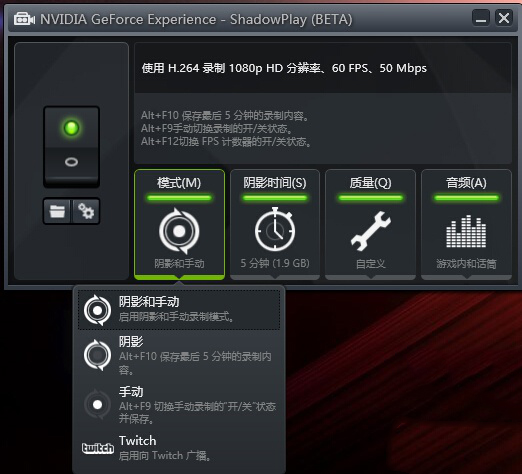 1.打開(kāi)NVIDIA Geforce experience,點(diǎn)擊右上角的“ShadowPlay”打開(kāi)錄制工具。點(diǎn)擊左側(cè)的開(kāi)關(guān)按鈕,將其保持在激活狀態(tài),接著選擇模式。模式分為:陰影和手動(dòng)、陰影、手動(dòng)和Twitch。在這里我們選擇手動(dòng)模式,方便隨時(shí)開(kāi)始和結(jié)束錄制。