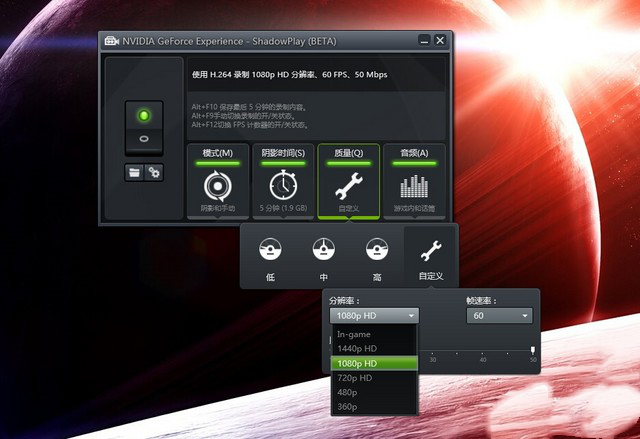 2.“陰影”我們可以不用看,因?yàn)樵谶@里我們不需要用到。點(diǎn)擊“質(zhì)量”,選擇視頻錄制畫(huà)質(zhì),分為低、中、高和自定義,我們推薦使用自定義。在自定義中,我們可以自己選擇分辨率、碼率和比特率,從360p到1440p,甚至到與游戲全屏同大小的in-game都可以自己選擇。