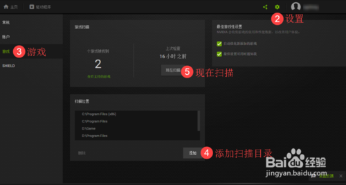 請(qǐng)檢查您的游戲是否支持最優(yōu)設(shè)置。您可以在“Settings”(設(shè)置)—>“Games”(游戲)選項(xiàng)卡上告訴 GeForce Experience 從何處查找游戲。添加游戲的安裝位置,然后單擊“Scan now”(立即掃描)以重新掃描。
