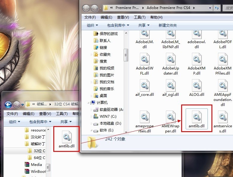 1.激活成功后就是對程序進行破解,如果不破解一天后就無法使用了。打開剛才解壓文件夾中的 破解補丁/32位 CS4 破解文件 ,把里面的amtlib.dll文件復(fù)制。