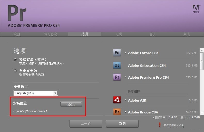 5.在進行安裝選擇的時候,注意選擇安裝位置;默認狀態(tài)下,安裝全部軟件和組建,也可以根據(jù)自己的需要取消一些程序的安裝。