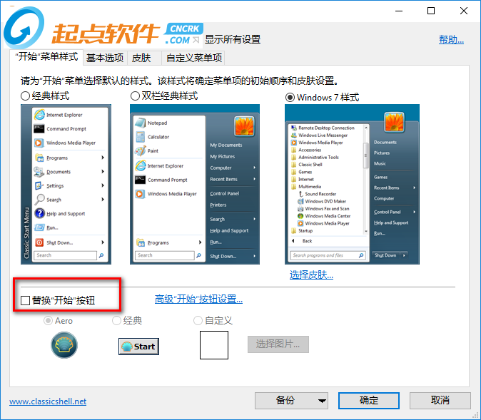 3、選擇開始菜單的圖標,擁有aero、經(jīng)典、自定義選擇,點擊選擇圖片可以自行設定
