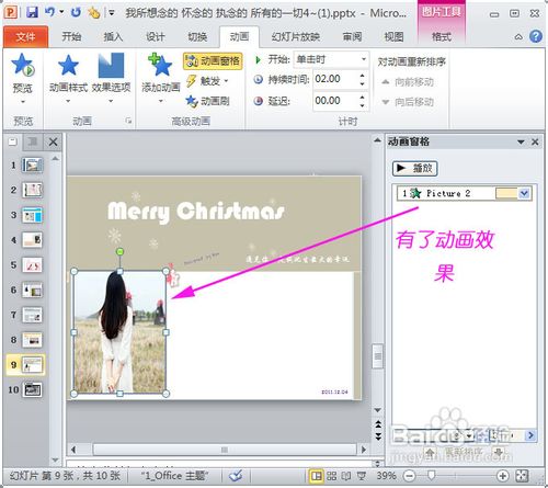 4、進入另外一張幻燈片上,將鼠標指針指向圖片,并點擊圖片,這個時候是不是發(fā)現(xiàn)這張原本沒動畫效果的圖片有了動畫呢?同時鼠標指針右邊的刷子圖案會消失。