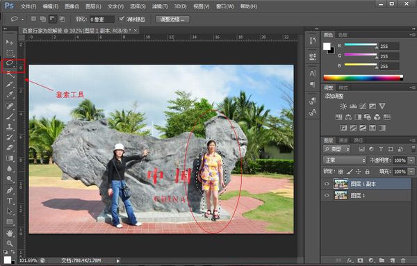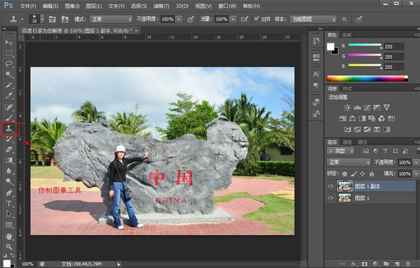 5、最后,選擇”仿制圖章工具“,按住Alt鍵吸取原始的部分作為源,然后對填充的部分進行涂抹。