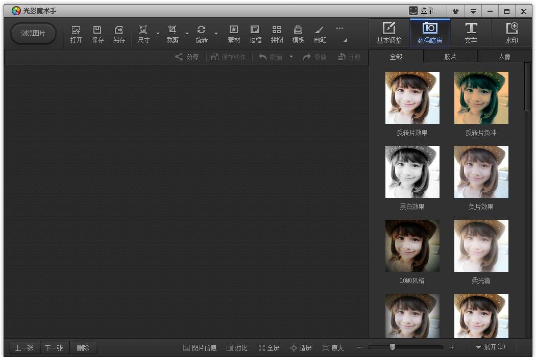 還在羨慕他人多變的照片風格嗎?沒關系,光影魔術手擁有多種豐富的數(shù)碼暗房特效,如Lomo風格、背景虛化、局部上色、褪色舊相、黑白效果、冷調(diào)泛黃等,讓您輕松制作出彩的照片風格,特別是反轉(zhuǎn)片效果,光影魔術手最重要的功能之一,可得到專業(yè)的膠片效果。
