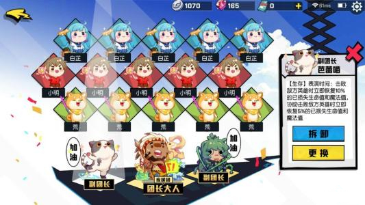 1號副團長:芭蕾喵*1,擊敗敵方英雄時立即恢復(fù)10%的已損失生命值和魔法值協(xié)助擊敗敵方英雄時立即恢復(fù)5%的已損失生命值和魔法值。