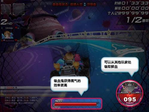 所有玩家開局時(shí)均為普通的飛車王國公民,每個(gè)玩家都有一定的HP,玩法與飛車傳統(tǒng)的競速模式一致。比賽過程中,德古拉會(huì)鎖定排名最后的玩家,與其建立惡魔契約,用兩個(gè)氮?dú)馀c其交換1點(diǎn)HP。