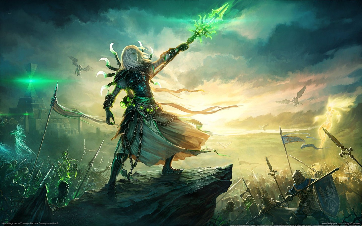 游戲的歷險故事的敘述時間先于《英雄無敵5》的情節(jié)時間達400多年,展示了一個英雄之家刺激、史詩般的故事,在那里天使們密謀重演未完成的戰(zhàn)爭。傳奇天使長首領(lǐng)在前世的種族戰(zhàn)爭中被殺害,帶著復(fù)仇之心重獲新生。以為準(zhǔn)備即將到來的惡魔入侵為借口,他集結(jié)亞山的民眾以期消滅他的世仇。然而,他卻低估了人性化的格里芬公爵王朝的力量。新作故事將圍繞著獅鷲公國展開,更具體點說是圍繞著獅鷲公國大公及其兒女展開,這一家的命運還真是十分悲劇,劇情中出現(xiàn)的第一任大公叫做帕維爾,他在與惡魔的作戰(zhàn)中英勇作戰(zhàn)、壯烈犧牲,
