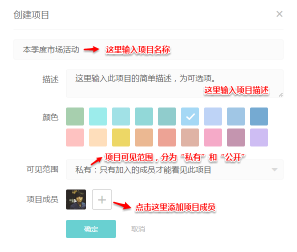 輸入項目基本信息(名稱、描述、顏色)并選擇可見范圍、項目成員