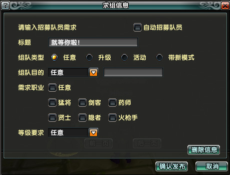 當前沒有組隊的玩家可以發(fā)布求組信息。