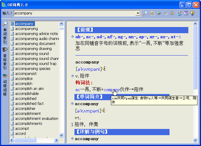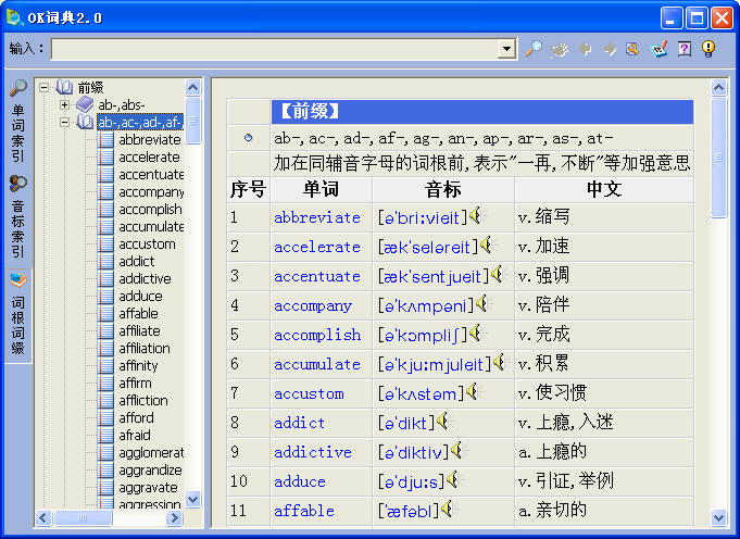 3.依據(jù)英語的詞根和詞綴構(gòu)成法則對超過了8000個單詞進(jìn)行了重新編排,我們花費(fèi)了大量的時間并且參考了相關(guān)的資料將所有的詞綴詞根,和相關(guān)的單詞都內(nèi)建鏈接,可以根據(jù)單詞直接找到相關(guān)的詞根詞綴 ,也可以根據(jù)詞綴詞根直接查找到相關(guān)的單詞,幫助學(xué)習(xí)者進(jìn)行聯(lián)想記憶,這些單詞大部分都是大學(xué)階段大綱要求掌握的常用詞匯,有些比較偏的詞匯也是TOEFL,GRE等考過的單詞。這些單詞對詞根詞綴有較大的“代表性”。 軟件對這部分單詞根據(jù)前綴詞根后綴的方式進(jìn)行了拆解,并通過聯(lián)想記憶的方式進(jìn)行了解釋。