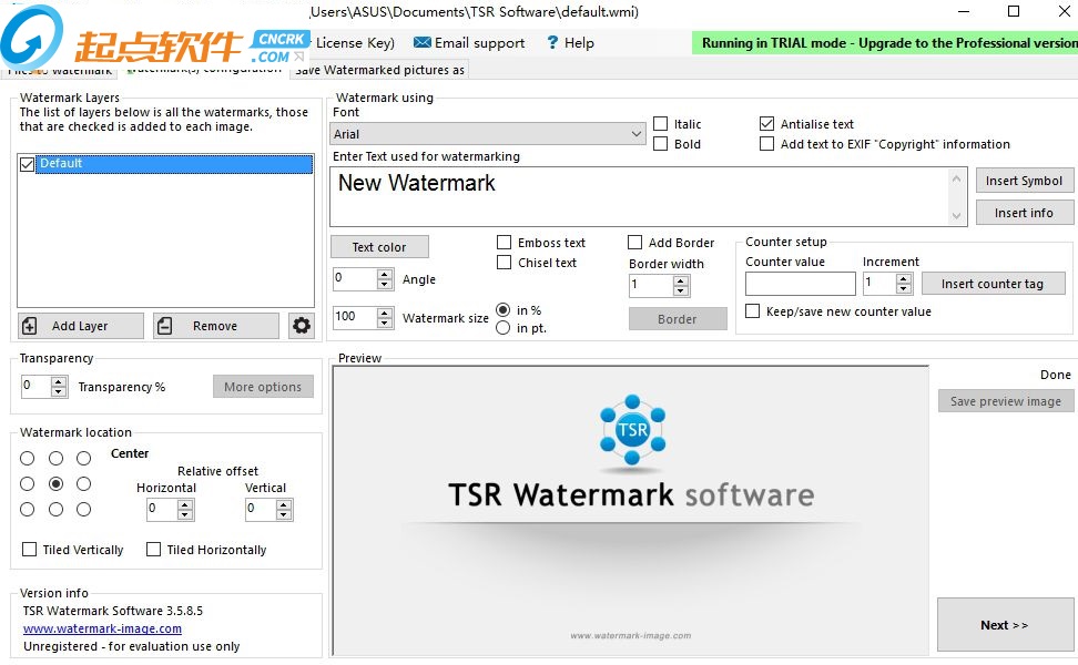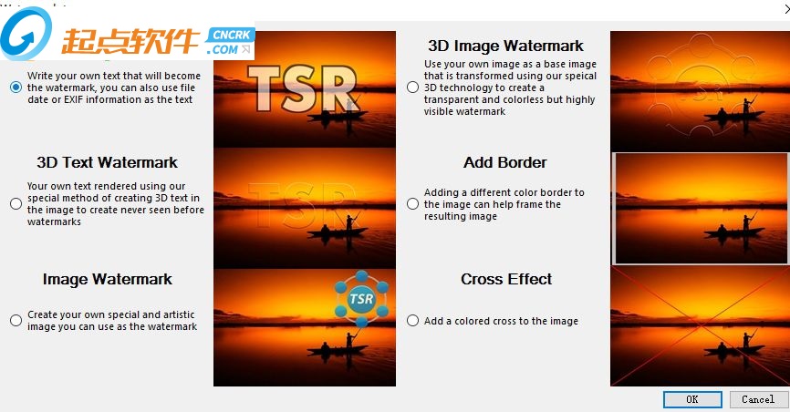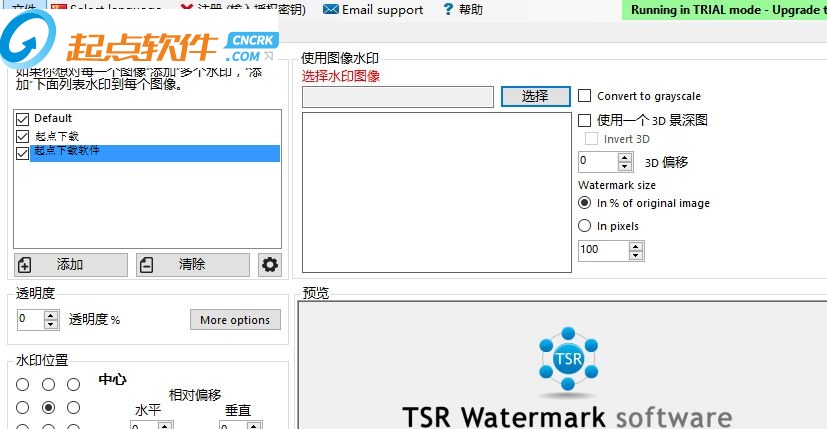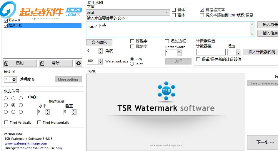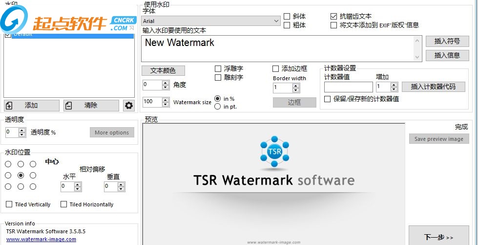 TSR Watermark Image可以添加數(shù)字水印到圖像,透明度支持自定義。你可以使用文字或其他作為水印的圖片創(chuàng)建水印來源。如果您要添加水印的背景,你可以設(shè)置標(biāo)志或文字,或多或少透明,并定義圖像上的透明顏色或選擇在上面的透明色的左上角第一個(gè)像素。您甚至可以使用photoshop,而不是到你的圖片水印,這是一個(gè)讓您所有的圖片上的水印更快更簡(jiǎn)單的軟件。【軟件特點(diǎn)】