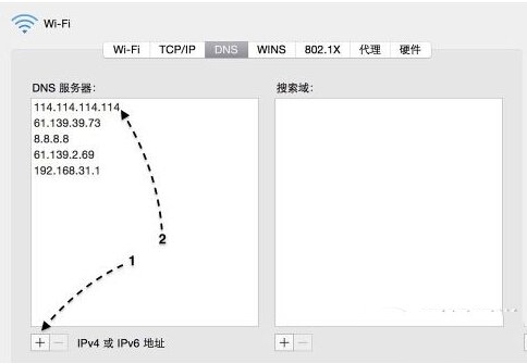 如下圖所示,可以先點擊窗口左下方的 + 按鈕,然后添加一個 114.114.11.114 DNS 地址,把它排列在第一位。
