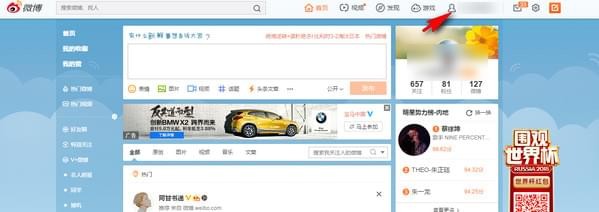 1、登錄個(gè)人微博,點(diǎn)擊箭頭所指;