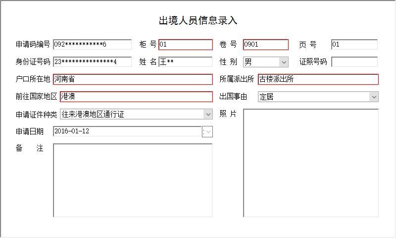 《出境人員信息管理系統(tǒng)》是對(duì)出國人員信息的管理,人員信息包括申請(qǐng)碼編號(hào)、身份證號(hào)碼、姓名、性別、戶口所在地、所屬派出所、前往國家地區(qū)、外出事由、申請(qǐng)證件種類,申請(qǐng)日期及照片等信息。分別可以按照身份證號(hào)碼、姓名、證照號(hào)碼等信息進(jìn)行查詢,也可以按日期查詢某段時(shí)間出境人數(shù)及具體人員名單。