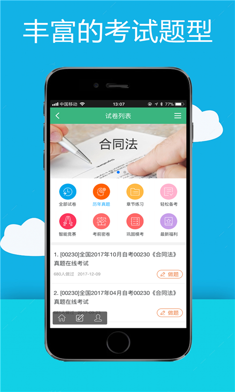 【考試題庫】豐富的自考題庫,題庫覆蓋300多個自考科目全面收錄近7年來歷年真題,模擬考試,每日一練,章節(jié)練習,輕松備考,智能競賽,考前密卷等,題庫的數(shù)量多達幾十萬多題。【視頻課堂】每周都會有直播課堂,無需報班就能和名師面對面交流探討。我們還為大家提供了大部分自考教材的精講課程。輕輕松松學習、快快樂樂自考。