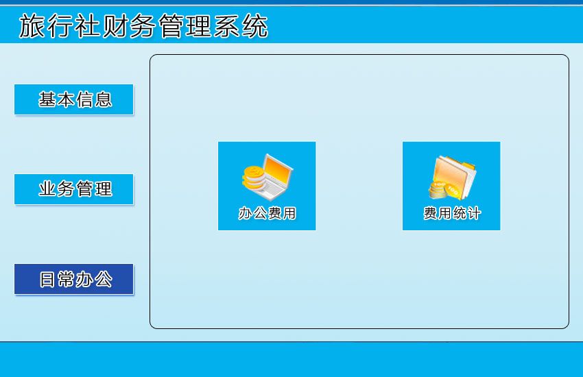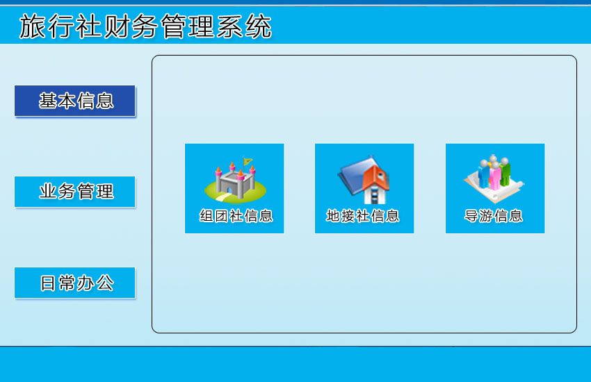 《旅行社財務(wù)管理系統(tǒng)》是專門針對旅行社內(nèi)部財務(wù)管理開發(fā)的一款軟件。該系統(tǒng)主要包含基本信息、業(yè)務(wù)管理、日常辦公三大模塊,信息錄入 詳細,查詢功能強大,讓您操作簡便、提高工作效率! 系統(tǒng)包含以下三大部分: 1.基本信息:組團社信息、地接社信息、導(dǎo)游信息; 2.業(yè)務(wù)管理:業(yè)務(wù)信息、交通成本費用(付交通成本費用、付交通成本費用審批、按期間查詢付交通成本費用)、地接社成本費用(付地接社成本費用、付地接社成本費用審批、按期間查詢付地接社成本費用)、總團款費用(收總團款費用、收總團款費用審批、按期間查詢收總團款費用); 3.日常辦公:辦公費用、費用統(tǒng)計。