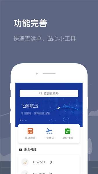 飛鯨專注于國內(nèi)、國際航空運輸,擁有全球龐大的服務(wù)網(wǎng)點,高覆蓋,高效率,以追求卓越的精神為客戶提供安全,經(jīng)濟(jì),專業(yè)的航空運輸訂艙的服務(wù)。當(dāng)前可以通過APP實現(xiàn)運單號查詢、運單信息編輯、物流詳情查詢等操作;通過APP的站內(nèi)消息,可以讓用戶及時掌握自己的運單處理情況,提高溝通處理效率。貼心的小工具功能,可以方便用戶快速的計算體積重量、查詢機(jī)場代碼、換算單位,真正的讓用戶把業(yè)務(wù)管理起來。