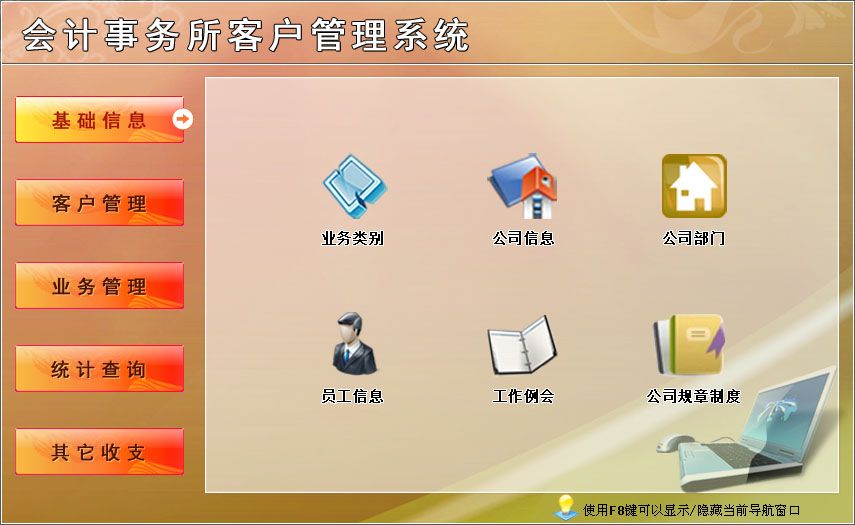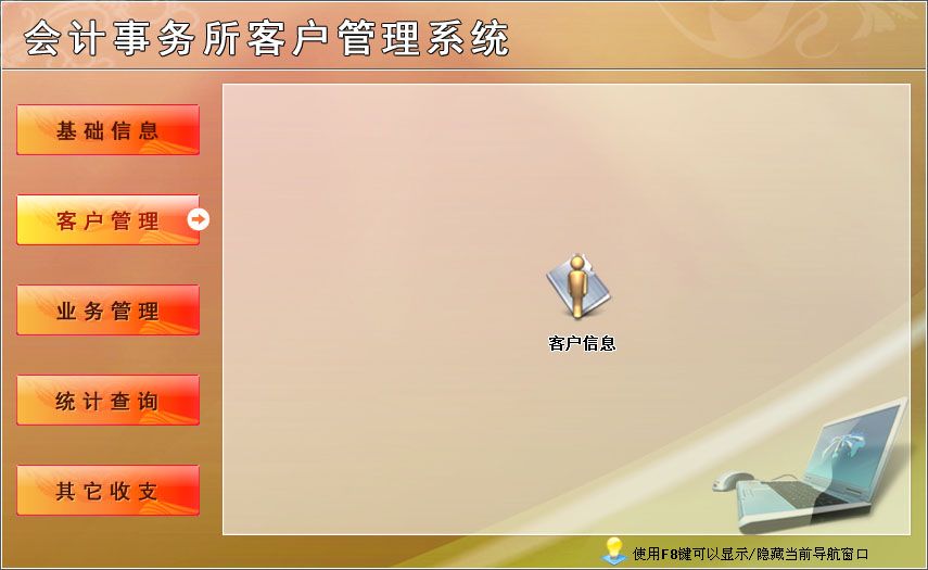 《會(huì)計(jì)事務(wù)所客戶管理系統(tǒng)》適用于中小型會(huì)計(jì)事務(wù)所管理客戶業(yè)務(wù)的軟件。主要包基本信息、客戶管理、業(yè)務(wù)管理、統(tǒng)計(jì)查詢、其它收支。本管理系統(tǒng)多處具有快速輔助錄入功能,操作簡(jiǎn)單,易學(xué)、易用;處理功能高效強(qiáng)大,是協(xié)助您的好幫手!