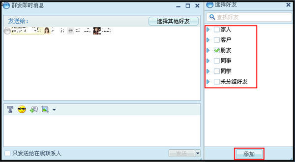 還可以點(diǎn)擊“選擇其他好友”按鈕,在右側(cè)彈出的聯(lián)系人列表中勾選要增加的聯(lián)系人,然后點(diǎn)擊“添加”按鈕: