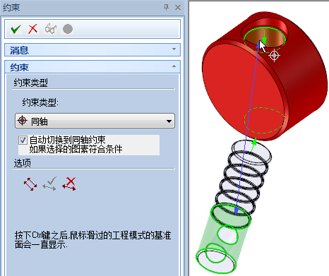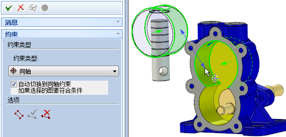 單擊“定位約束”按鈕,左鍵選擇柱塞軸,“約束類(lèi)型”自動(dòng)調(diào)整為“同軸”,然后用鼠標(biāo)左鍵選擇圓盤(pán)孔,如圖所示。