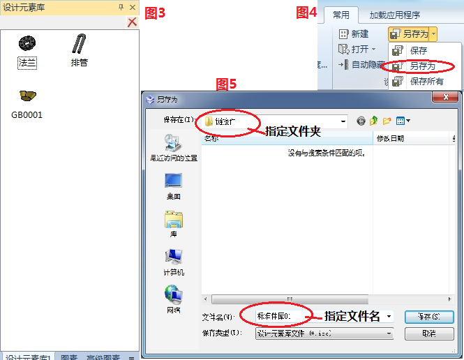 第二, 我們?cè)谠O(shè)計(jì)產(chǎn)品的時(shí)候也是需要分門(mén)別類(lèi)的所以建立設(shè)計(jì)元素庫(kù)的時(shí)候也要遵循一些原則,我們可以多建庫(kù)來(lái)以免使用的時(shí)候找不到或者花費(fèi)大力氣來(lái)找。這是一個(gè)溫馨提示喲。接下來(lái)進(jìn)入我們的正題下一步的操作。就是將我們繪制好的圖形,依次用鼠標(biāo)左鍵的拖拽方式拖入到咱們的設(shè)計(jì)元素庫(kù)中最好命名或者以咱們自己企業(yè)內(nèi)部的代號(hào)來(lái)命名也便于查詢(xún)。拖入新建元素庫(kù)中的效果如圖3所示?,F(xiàn)在我們將制定好的元素庫(kù)通過(guò)如圖1所示的常用菜單欄下的保存下的另存為如圖4,另存到我們的指定文件夾中并修改為特定的名稱(chēng)。如下圖5所示。這個(gè)元素庫(kù)在我們重新打開(kāi)軟件的時(shí)候是不在設(shè)計(jì)元素庫(kù)顯示的,如果我們需要使用到此元素庫(kù),就在“常用”菜單欄下的“打開(kāi)”按鈕下找到我們指定的文件夾和文件打開(kāi)即可使用。