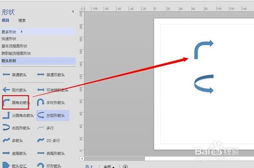 還有一種方法是在Visio中有模版提供箭頭圖, 具體位置見圖示, 直接選中需要的箭頭拖動到繪圖區(qū)域即可.
