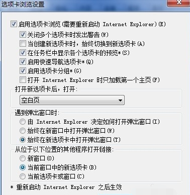 4、點(diǎn)擊“Internet選項(xiàng)”對(duì)話框中的選項(xiàng)卡對(duì)應(yīng)的“設(shè)置”按鈕,軟件將彈出“選項(xiàng)卡瀏覽設(shè)置”窗口,如下圖所示: