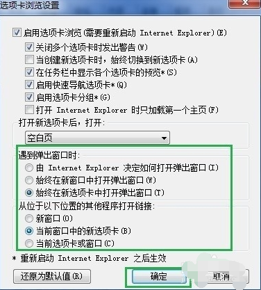 5、在“選項(xiàng)卡瀏覽設(shè)置”窗口中根據(jù)需要勾選“遇到彈出窗口時(shí)”的三個(gè)子項(xiàng)的任意一項(xiàng)以及“從位于以下位置的其他程序打開(kāi)鏈接” 的三個(gè)子項(xiàng)的任意一項(xiàng),然后點(diǎn)擊“確定”即可完成新頁(yè)面的默認(rèn)打開(kāi)方式的設(shè)置,如下圖所示:
