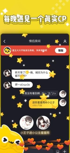 星主大大不僅是你們的紅娘,特點(diǎn)各異的星主們還會(huì)在“舞會(huì)大廳”中組織各種有趣的多人游戲,你畫(huà)我猜、爆照破冰、成語(yǔ)接龍、爆音唱歌、真心話大冒險(xiǎn)....只有你想不到,沒(méi)有星主做不到的。