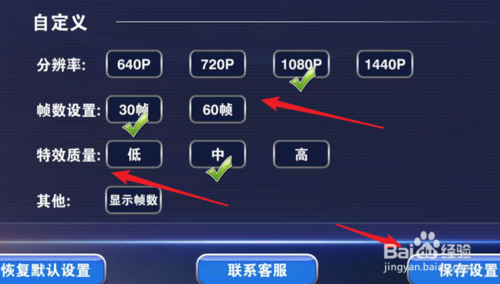 如果手機(jī)性能一般,或者在游戲過(guò)程中有卡頓的情況,我們就按自定義設(shè)置一下,把分辨率,幀數(shù)調(diào)低一點(diǎn)。特效調(diào)整到‘低’