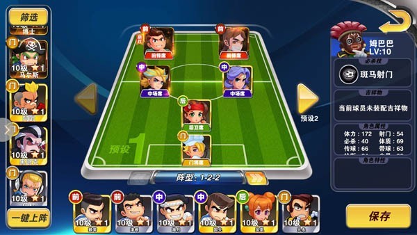 中后場(chǎng)三人組是整個(gè)游戲中力量最強(qiáng)的組合。桑巴是標(biāo)準(zhǔn)的站樁中鋒,主要作用是在前場(chǎng)爭(zhēng)奪球權(quán)和中路的搶點(diǎn)。大耳朵其實(shí)適用于任何陣容,如果沒(méi)有的話也可以用一個(gè)擅長(zhǎng)帶球和傳中的前鋒跟桑巴配合